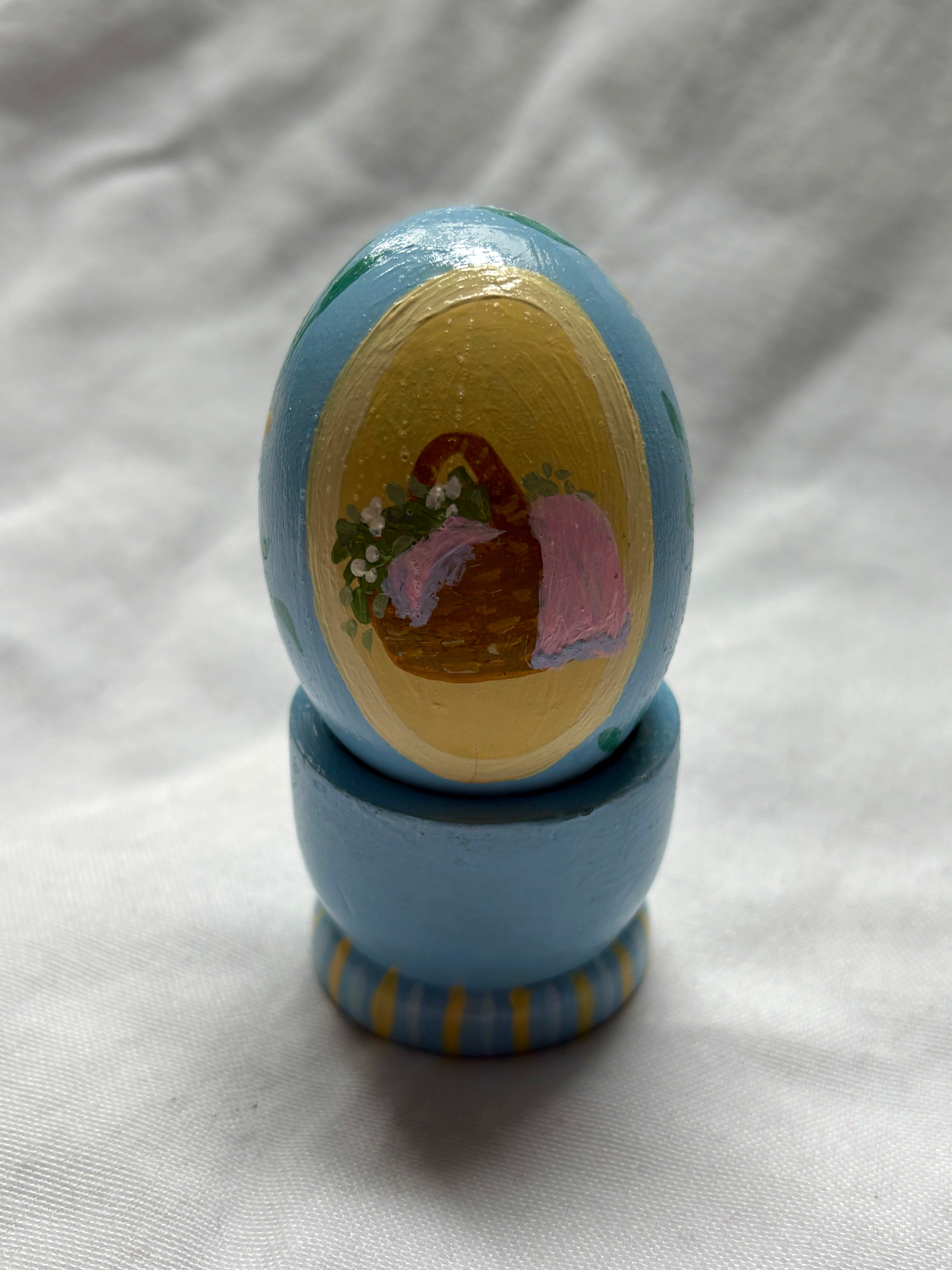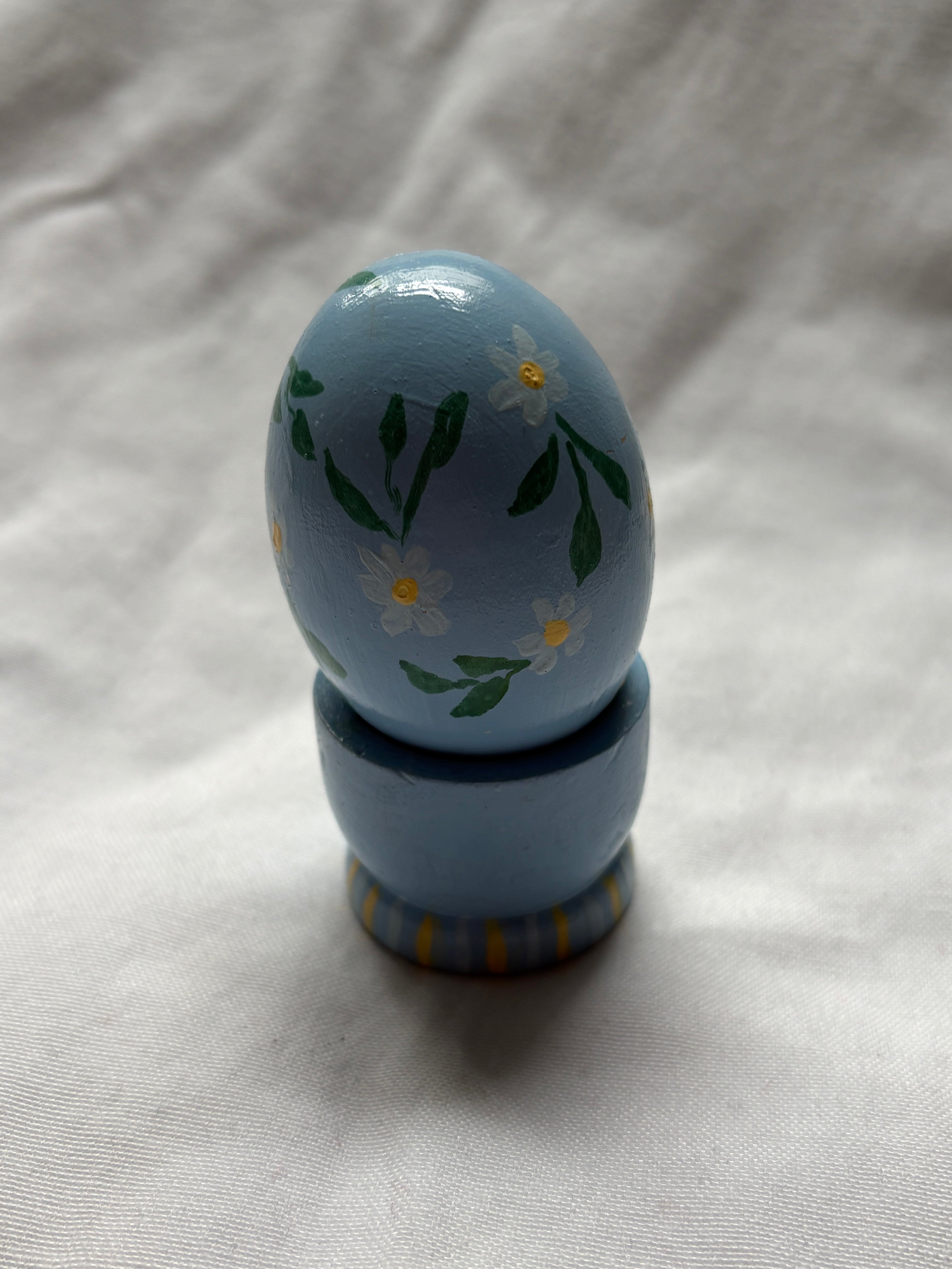 A charming wooden egg, hand-painted and standing 3 inches tall on its matching base. Both the egg and stand measure 1.5 inches wide, making it a delicate decorative piece perfect for shelves or collections.